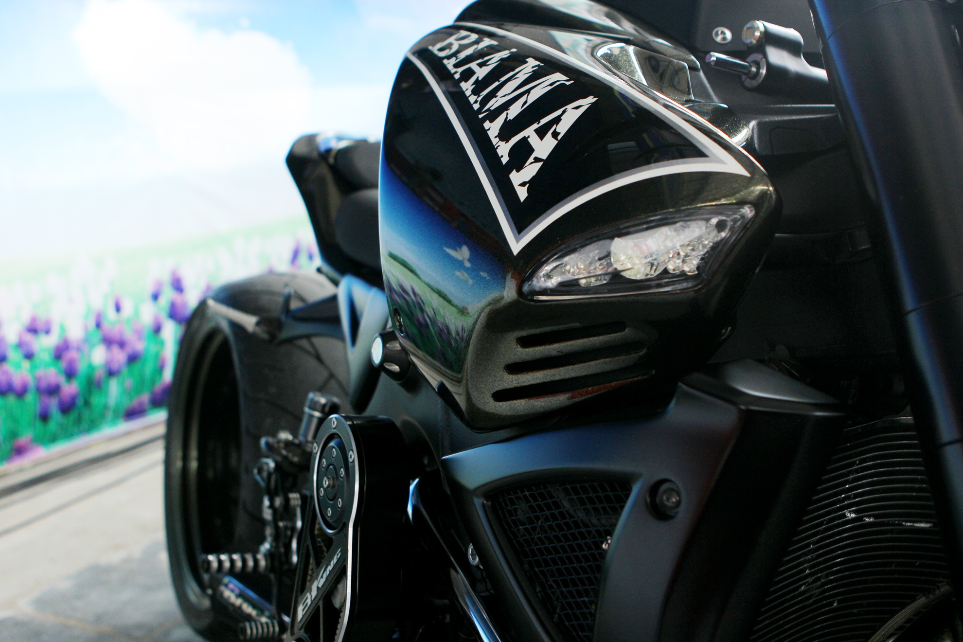 Chiếc naked-bike Suzuki B-King của một biker ở Hà Nội lột xác hoàn toàn khi sở hữu cặp lốp to bản, dàn áo góc cạnh, hầm hố cùng những công nghệ điện tử từ Đức.