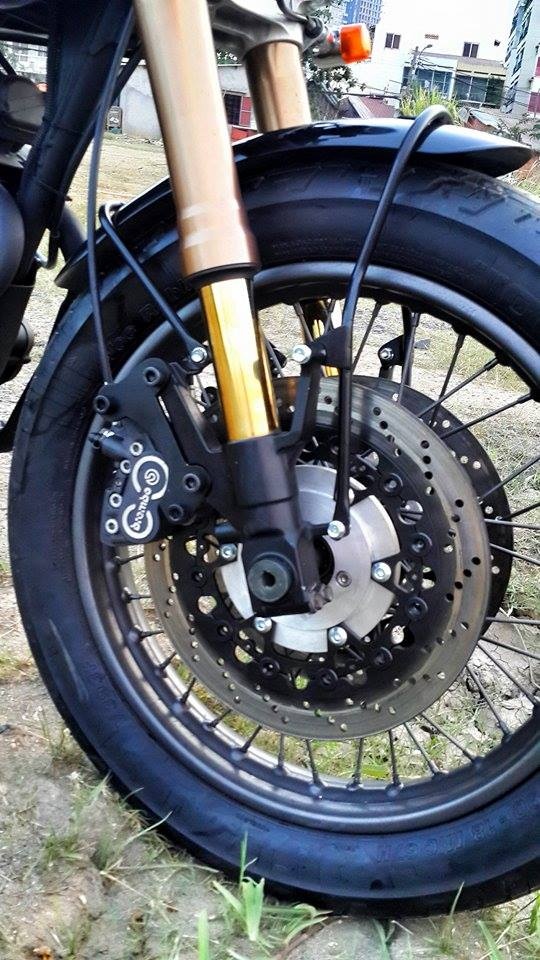 | Phuộc trước lấy từ siêu mô tô Suzuki Hayabusa 1300. Cặp đĩa phanh trước mang hiệu Brembo. Cặp heo dầu Brembo của BMW. |