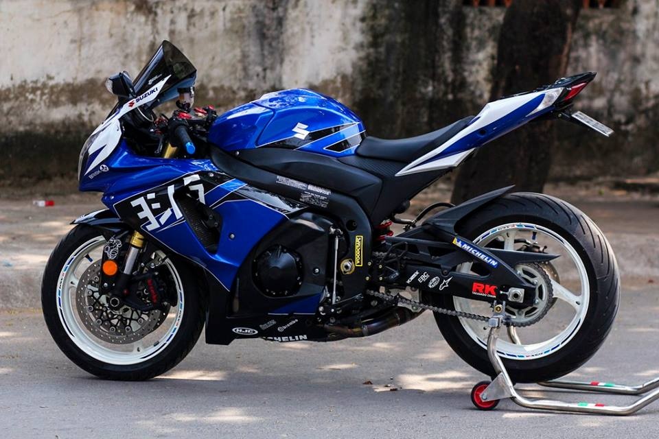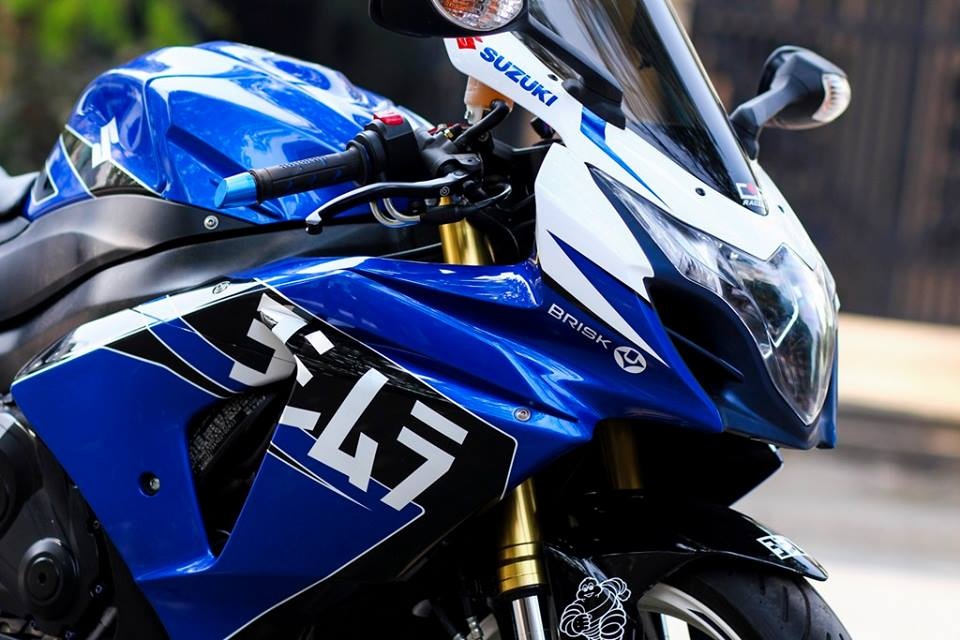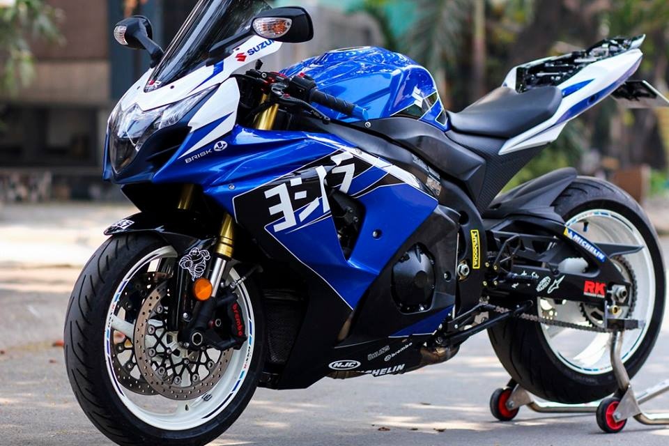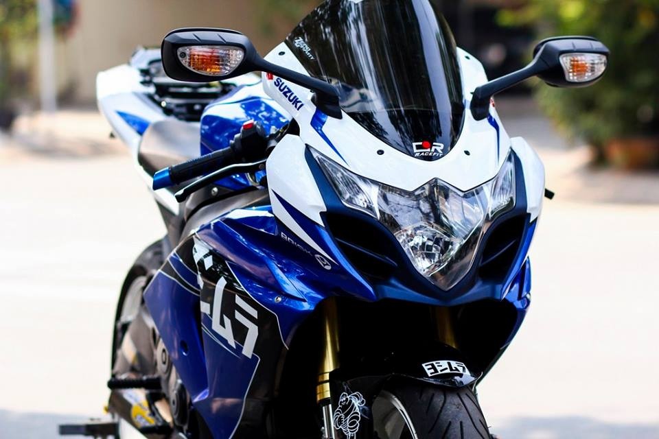 | Suzuki GSX-R1000 nguyên bản màu trắng, sơn tem hãng màu xanh. Sau đó, chủ nhân của nó độ lại bằng cách sơn tem đấu lịch lãm hơn nhưng vẫn giữ phong cách thể thao. |