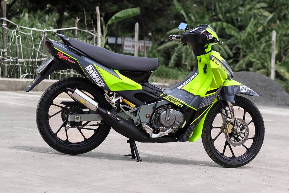 Chiếc Suzuki RGV 120 đời 2000 nguyên bản màu đỏ. Để tạo sự độc đáo, chủ nhân của nó đã độ lại dàn áo với màu xanh Neon chủ đạo.