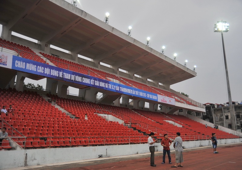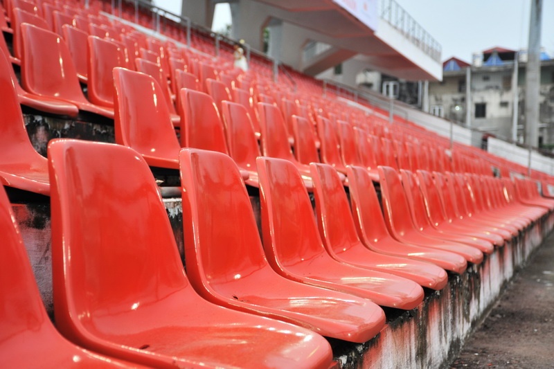 | Hàng ghế trên khán đài A được BTC sân Lạch Tray sơn lại toàn bộ màu đỏ rất rực rỡ. |
