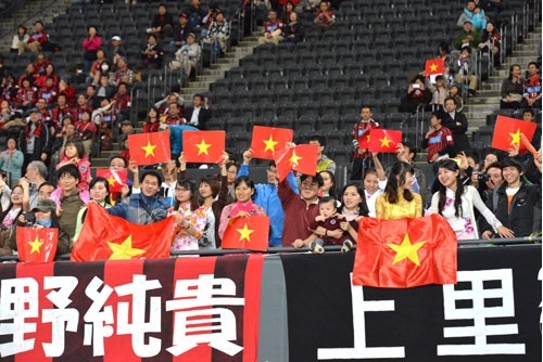 | Kiều bào Việt Nam tại Nhật Bản mặc áo dài truyền thống tới cổ vũ Công Vinh thi đấu. |