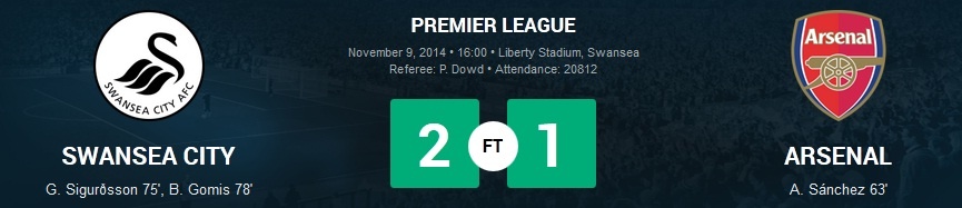 Đúng lúc này trọng tài thổi còi kết thúc trận đấu giữa Swansea và Arsenal. Chung cuộc, Pháo thủ thành London để thua với tỷ số 1-2 cho dù có bàn dẫn trước ở phút 64.