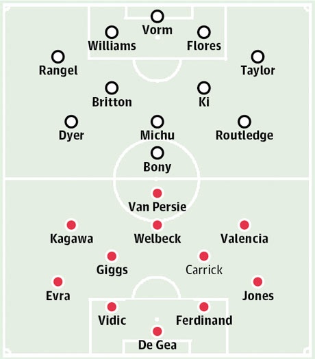 Ngoài ra, khả năng thi đấu của tiền vệ lão tướng Michael Carrick vẫn còn bỏ ngỏ, bởi tuyển thủ người Anh hiện gặp vấn đề liên quan đến đường ruột. Trong trận gặp Swansea, HLV David Moyes còn đang phân vân về việc sử dụng hậu vệ Evans và cầu thủ chạy cánh Ashley Young do gặp vấn đề ở mắt cá chân, trong khi đó tiền đạo Hernandez dính chấn thương gân khoeo.