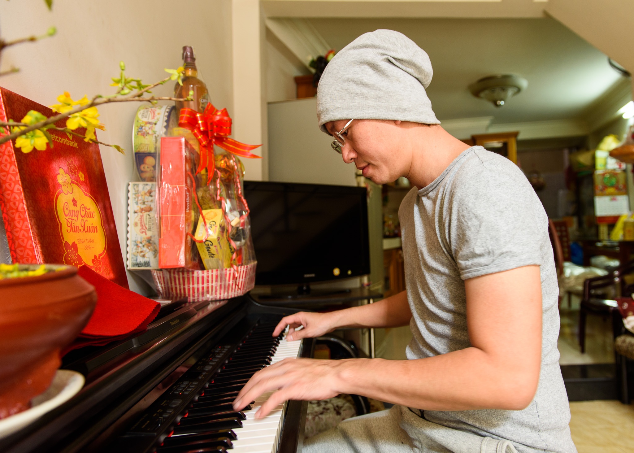 Nhạc sĩ Tình yêu đầu tiên cho biết, một tháng trước mẹ anh bị ngã gãy tay khi đang lau bóng đèn nên giờ bà không làm được việc nặng. Để giúp mẹ, anh dậy từ sớm để dọn dẹp và bài trí ngôi nhà cho có không khí Tết. |