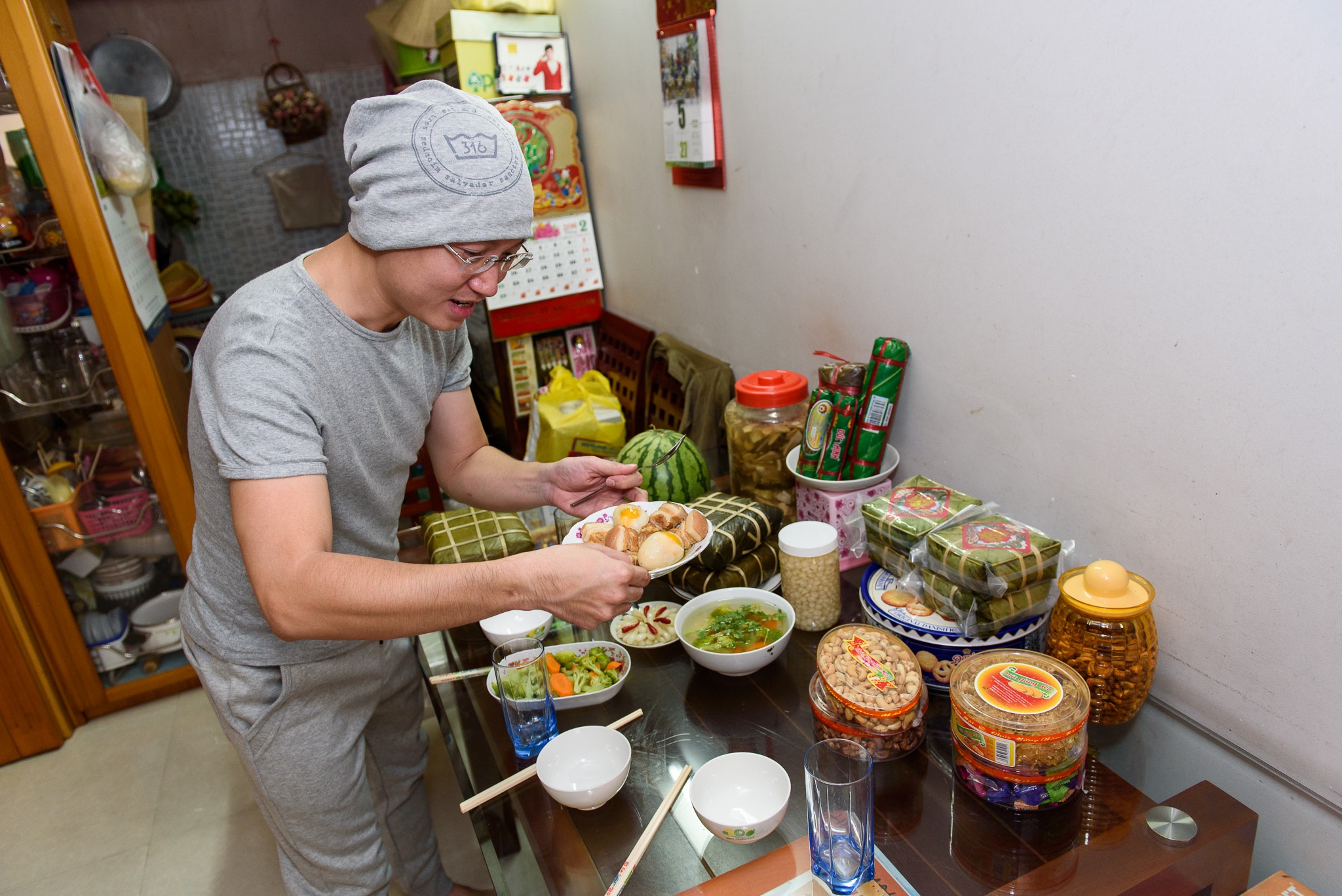 Nhà ít người nhưng ngày Tết không thiếu các món đặc trưng như bánh chưng, củ kiệu, bánh mứt... |