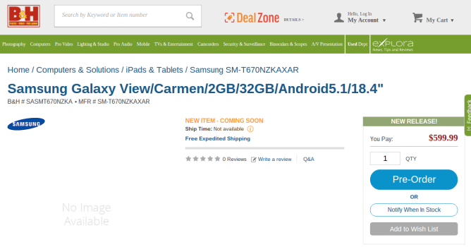 Một số trang bán lẻ đã cho người dùng đặt hàng trước chiếc Galaxy View của Samsung. B&H và Adorama đều tiết lộ, tablet 18,4 inch này có RAM 2 GB và chạy trên nền tảng Android 5.1. Phiên bản với bộ nhớ trong 32 GB có giá bán 599 USD (khoảng 13,2 triệu đồng). Tuy nhiên, thông tin trên đã đồng loạt được gỡ bỏ ngay sau đó.
