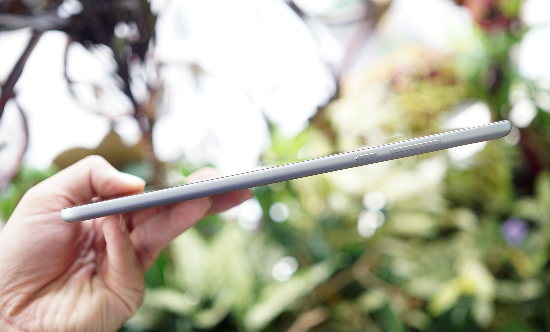 | Mi Pad 2 có độ mỏng chỉ 6,95 mm, nặng 322 gram, nhẹ hơn Mi Pad đời đầu. Cạnh bên của máy có phím nguồn và phím âm lượng, không có chốt gạt để tắt âm hay khoá xoay màn hình như trên iPad. |