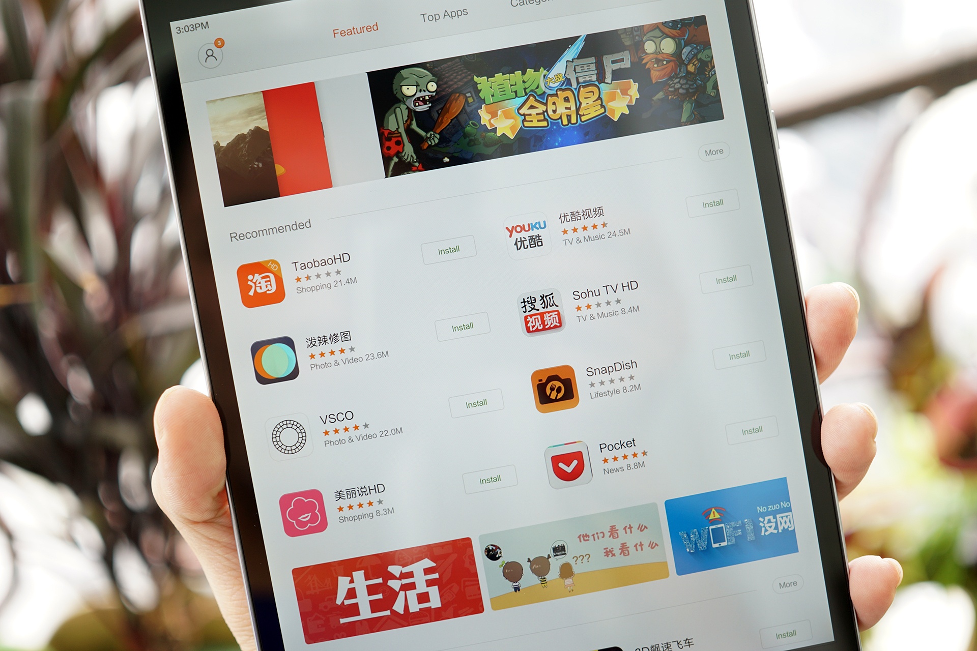 | Là thiết bị được sản xuất riêng cho thị trường Trung Quốc, Mi Pad 2 không có sẵn gian ứng dụng Google Play Store. Thay vào đó là kho phần mềm Mi Store từ Xiaomi. Người dùng có thể tìm thấy khá nhiều ứng dụng phổ biến như Pocket, VSCO Cam,... |
