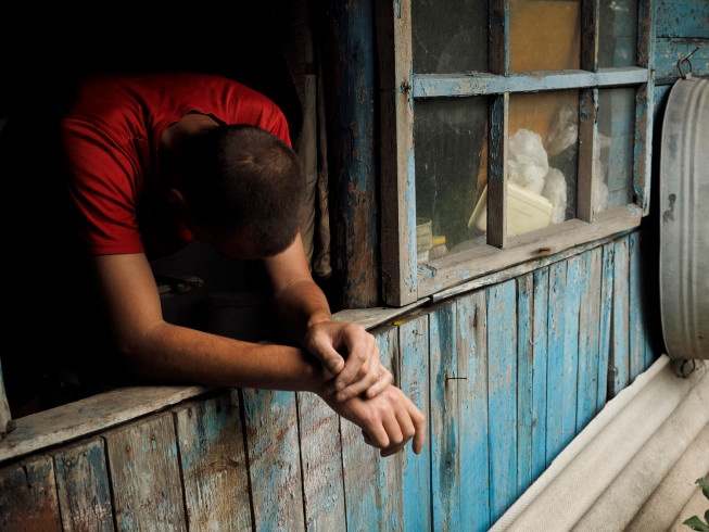 Igor Tiponov, một thanh niên 26 tuổi, gục đầu bên cửa sổ ngôi nhà. Hành khách trên phi cơ Boeing 777 của hãng hàng không Malaysia Airlines rơi xuống phòng ngủ của Tiponov hôm 17/7 khiến mái của ngôi nhà sập. |