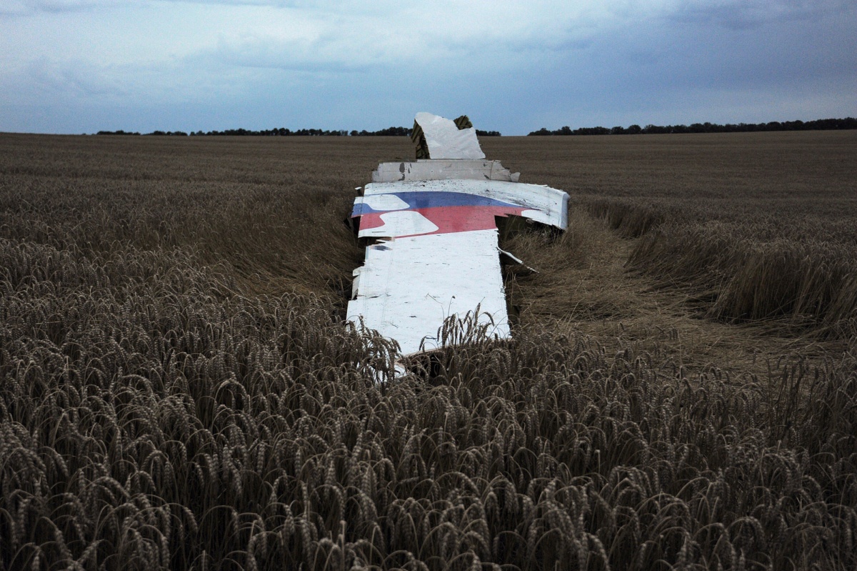 Mảnh vỡ lớn của máy bay nằm giữa cánh đồng. Nó mang màu sắc đặc trưng và một phần logo của hãng hàng không Malaysia Airlines. |