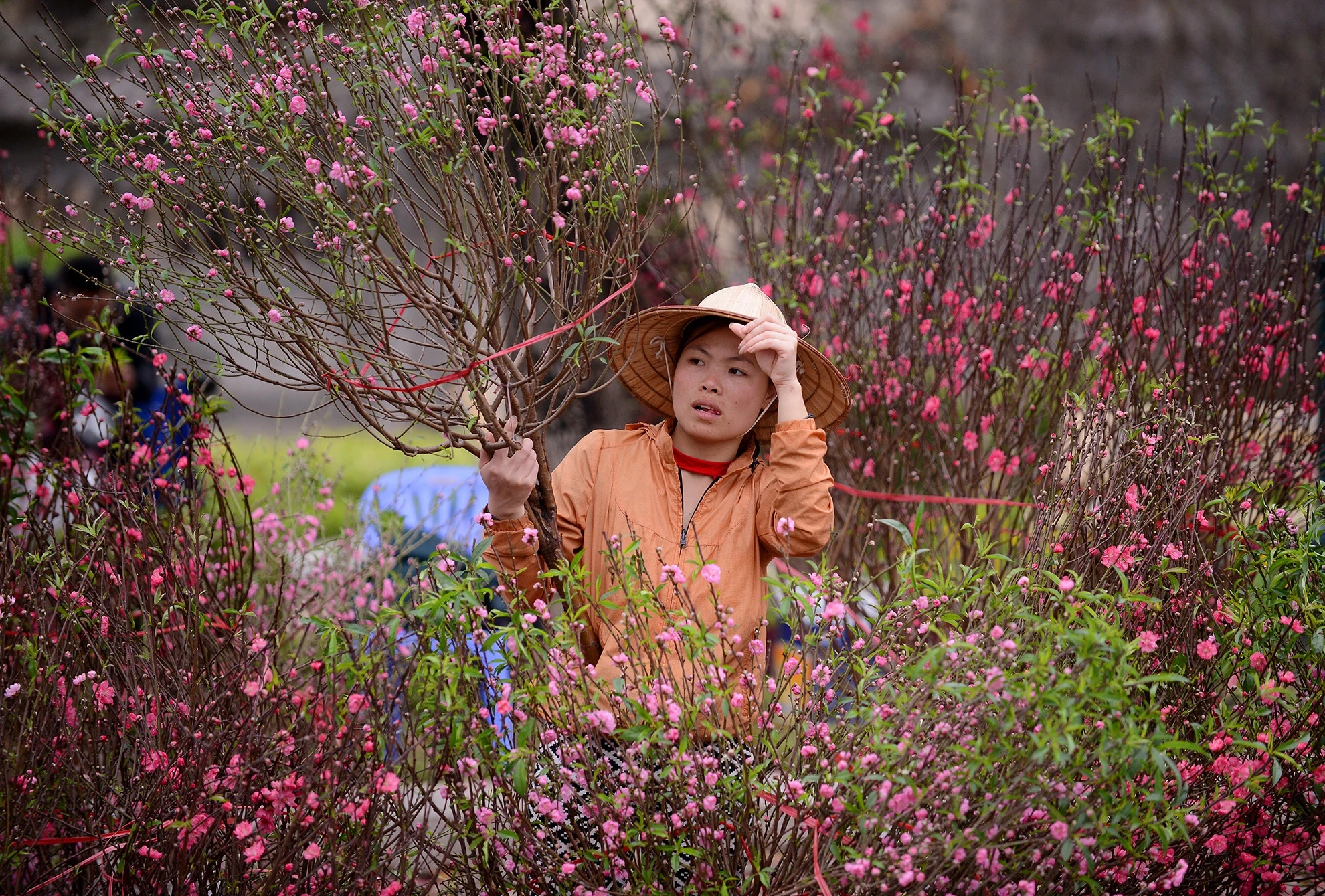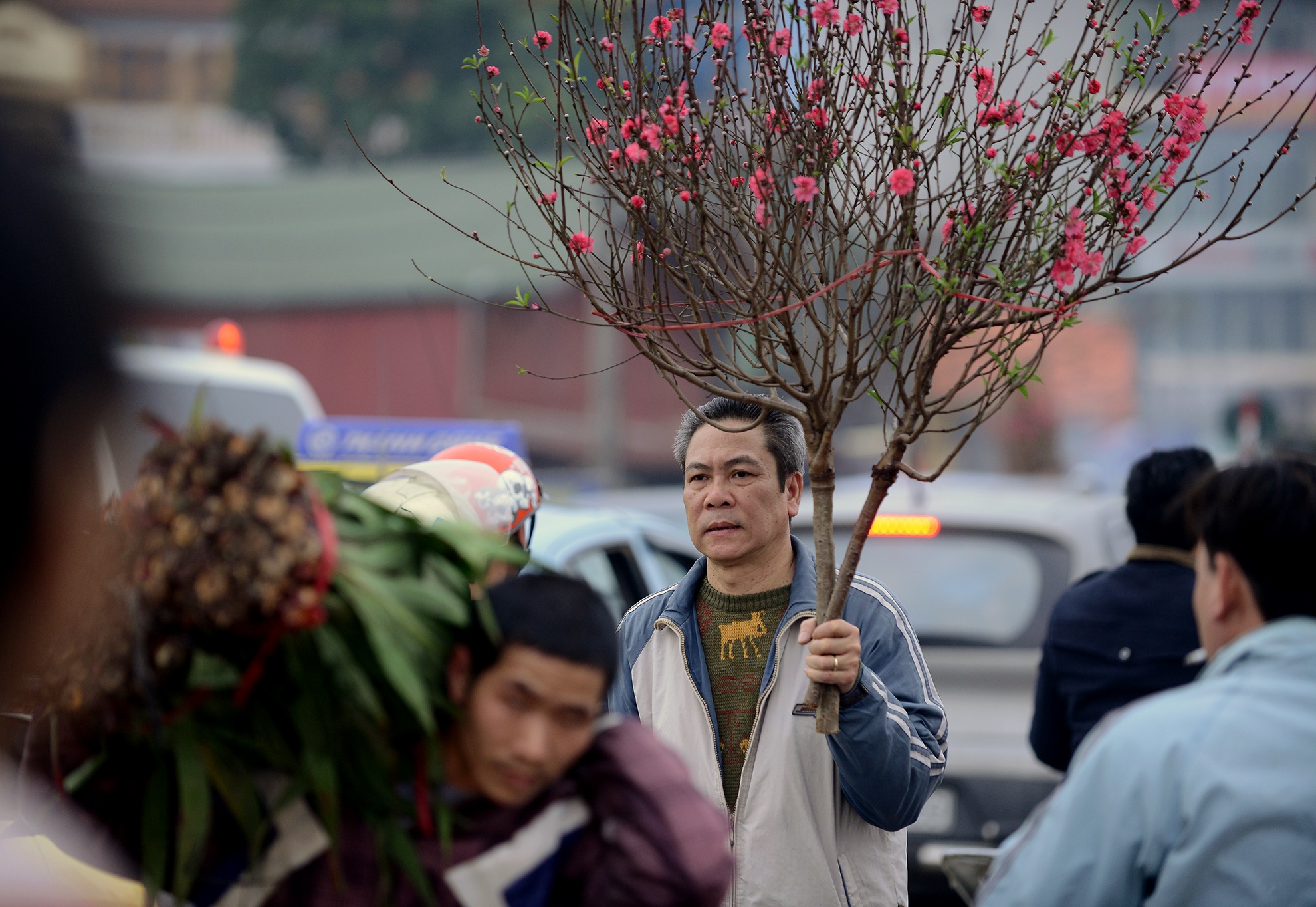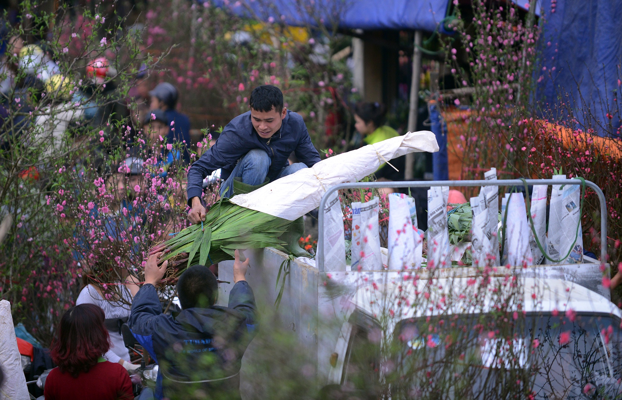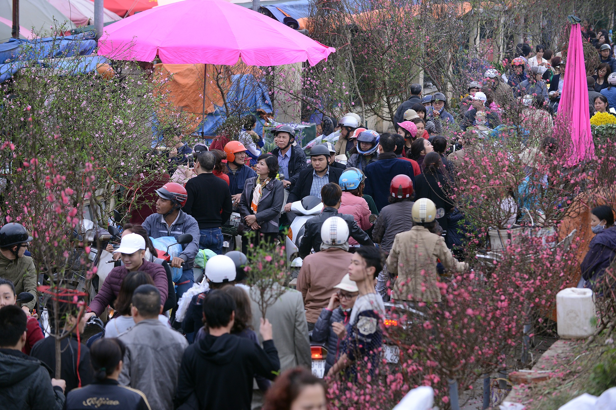 | Phía dưới chợ, dòng người đổ về nườm nượp. Không chỉ đào Nhật Tân được bán tại chợ mà còn có cả đào rừng. |
