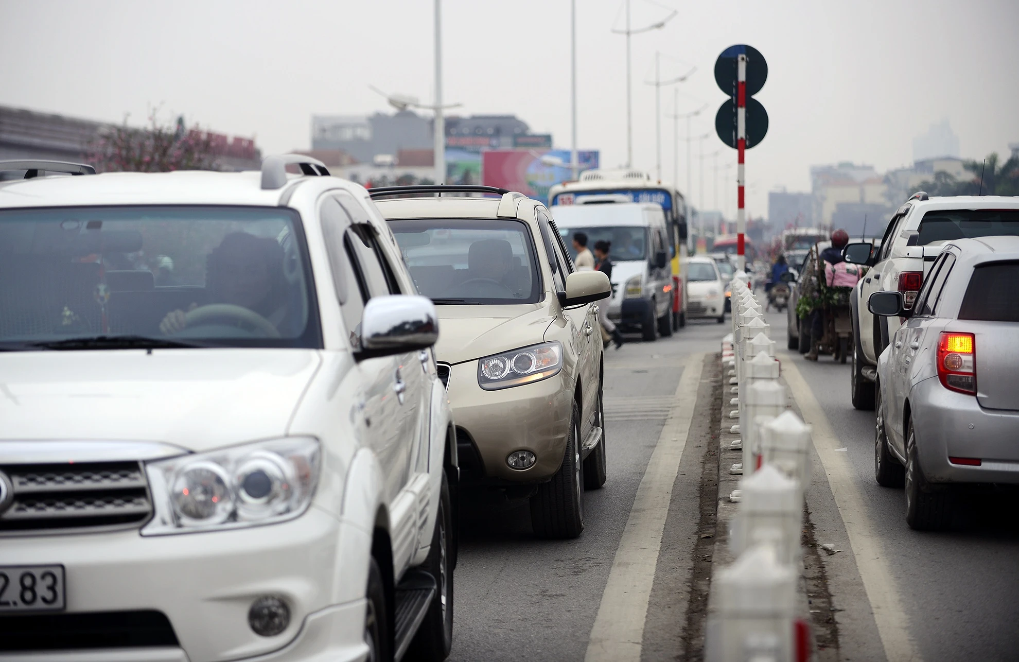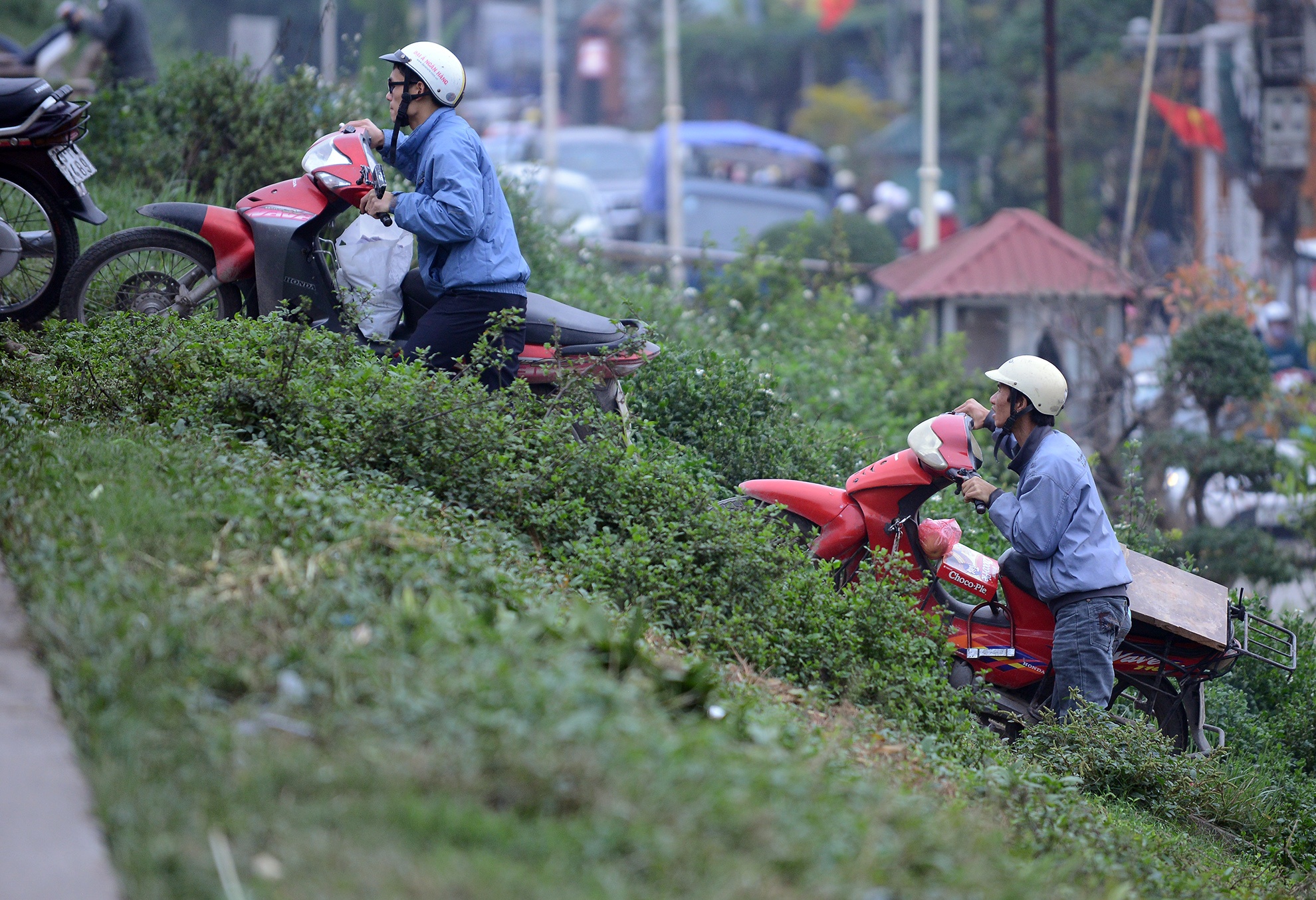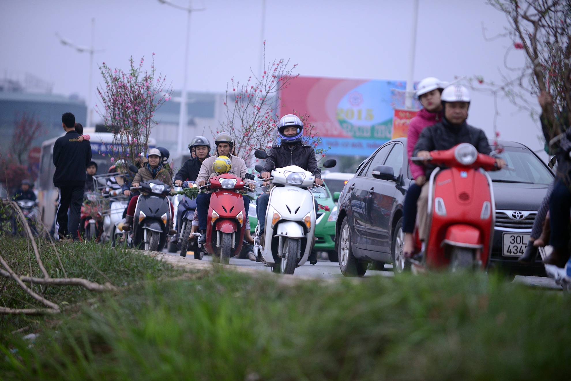| Các phương tiện nối đuôi nhau, xếp hàng dài trên đường. Đoạn ùn tắc nhất từ cổng vào chợ hoa đến đình Tứ Liên (khoảng 2 km). |