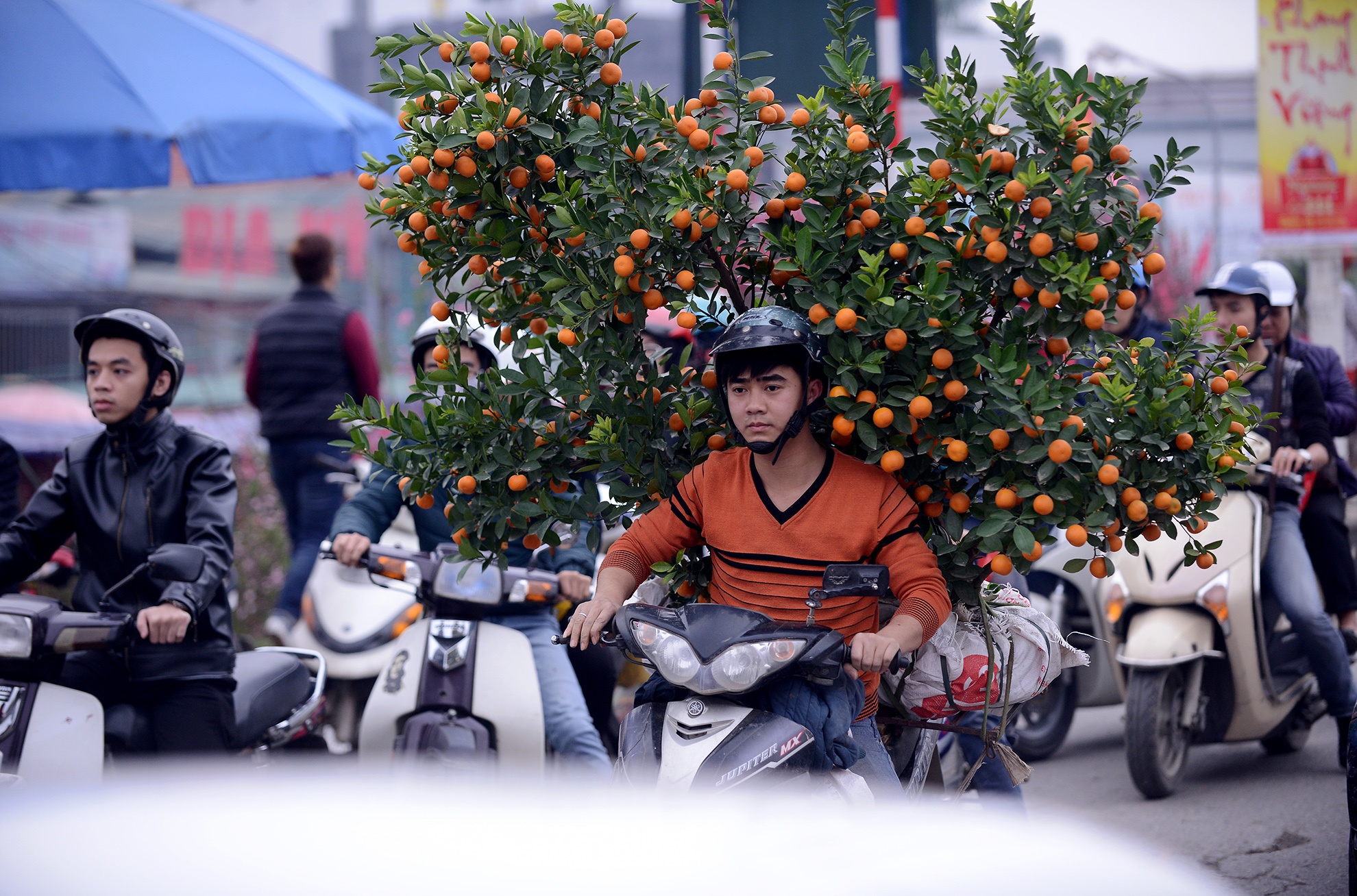 | Quất cảnh bon chen giữa dòng xe cộ đông đúc. |