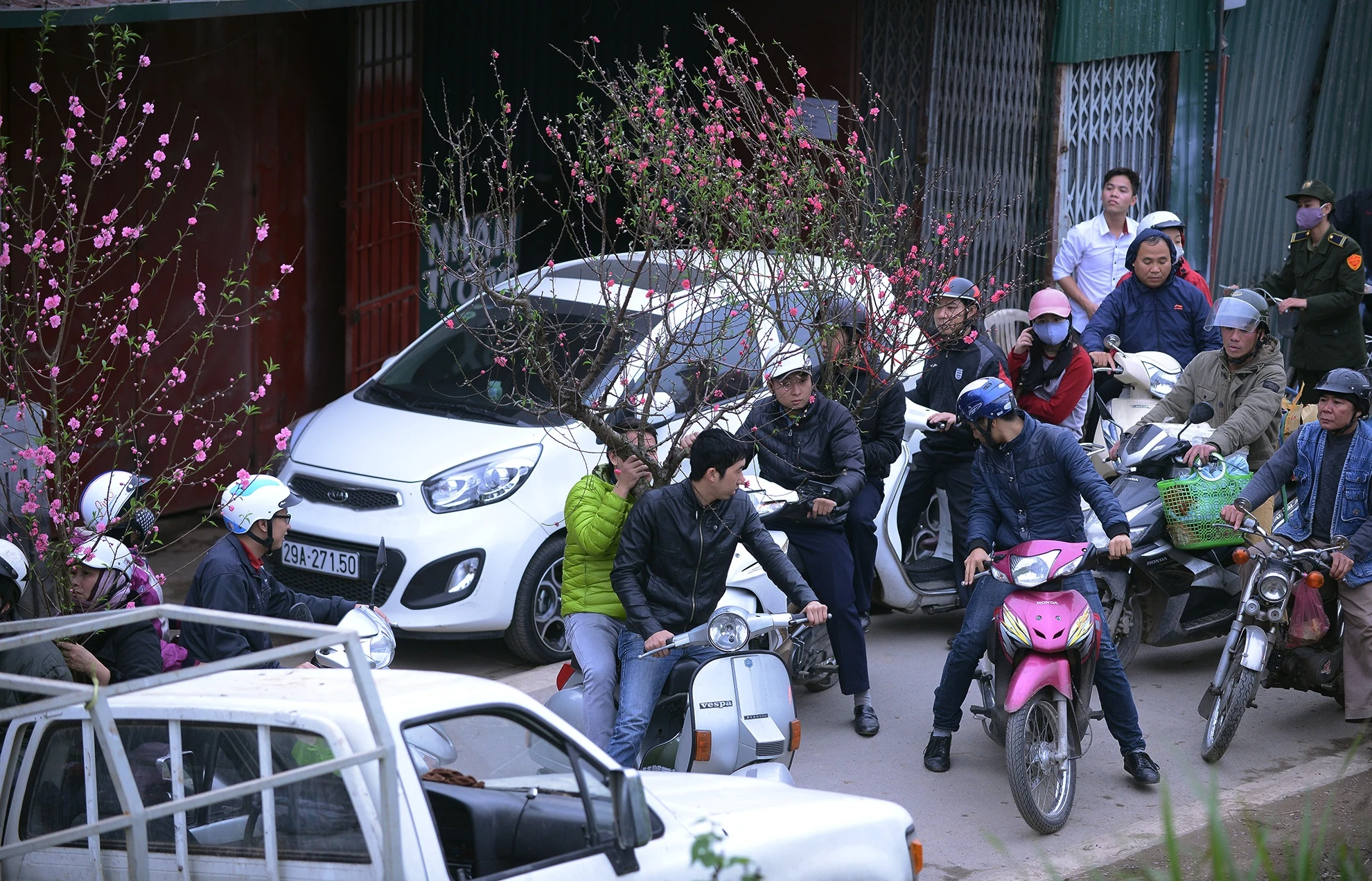 | Hai ngày nay, khu vực đường Nghi Tàm chạy qua chợ hoa Quảng Bá luôn trong tình trạng ùn tắc do người dân Hà Nội đổ về mua sắm đào và các loại hoa chơi Tết. |