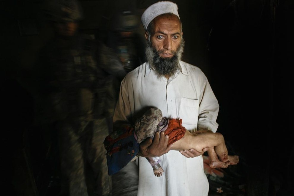 Nông dân Afghanistan bế đứa con bị thương trong ngôi nhà ở tỉnh Kunar năm 2007. Ảnh: Hetherington/AP