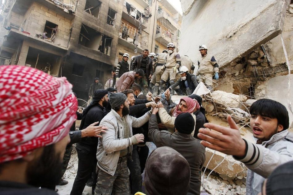 Các chiến binh chống chính phủ Syria đưa thi thể một người thiệt mạng khỏi ngôi nhà bị sập vì đợt không kích của quân đội chính phủ vào Aleppo hôm 17/12/2013. Ảnh: Barakat/ Reuters