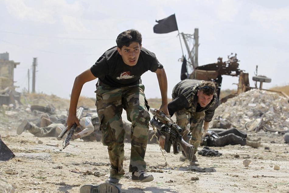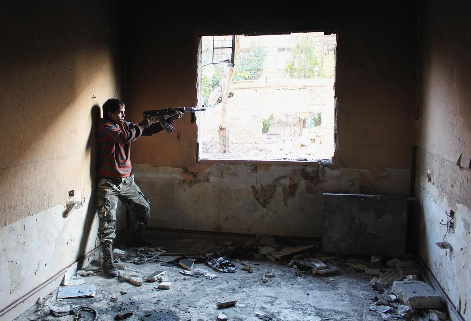 | Xạ thủ của lực lượng chống đối chính phủ Syria di chuyển tìm vị trí ẩn nấp. Ảnh: Barakat/Reuters |