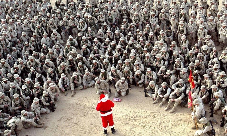 Hàng trăm thủy quân lục chiến Mỹ vây quanh “Ông già Noel” tại doanh trại ở sa mạc Kuwait ngày 24/12/2002. Ảnh: Niedringhaus/AP