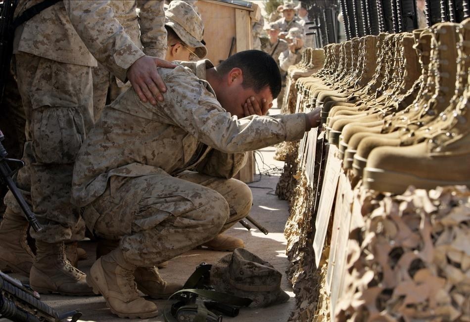 Binh sĩ Mỹ gục khóc trước di vật của 31 đồng đội tại Trại Korean, gần Rutbah, miền tây Iraq hôm 2/2/2005. Ảnh: Niedringhaus/AP