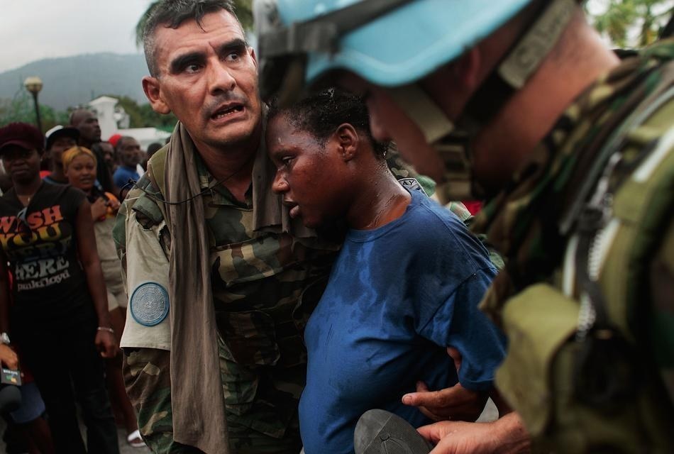 Lực lượng gìn giữ hòa bình Liên Hiệp Quốc giúp đỡ một phụ nữ Haiti mang thai khi cô chen lấn để lấy gạo cứu trợ sau trận động đất mạnh ở năm 2010. Ảnh: Hondros/Getty