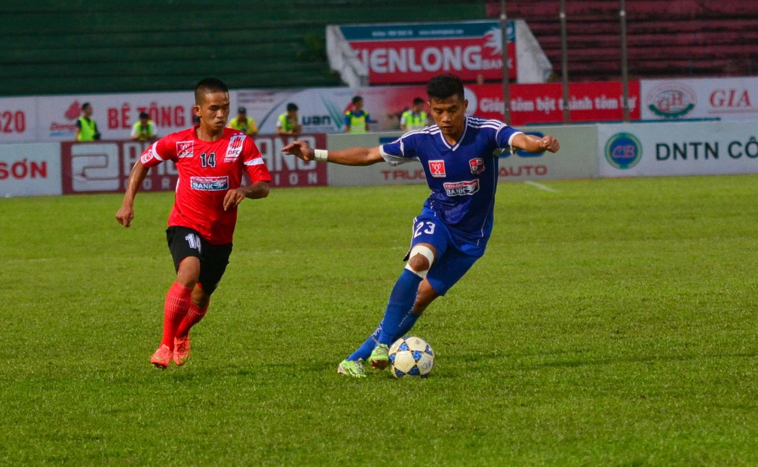 | Tấn công nhiều nhưng phải đến phút 37, ĐTLA mới ghi được bàn thắng đầu tiên. Xuất phát từ đường tạt bóng của Võ Nhật Tân bên cánh trái, Tài Em đánh đầu kỹ thuật đánh bại thủ môn Danh Hoàng Tuấn. HLV Trần Bình Sự của Đồng Nai thừa nhận đây là bàn thắng đẳng cấp bởi Tài Em dứt điểm trong tư thế rất khó. |