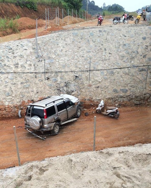 Tại hiện trường, chiếc xe gặp nạn bị hư hỏng nặng. Nhiều bộ phận bị vỡ nát, rơi vương vãi trên bờ cống chui. Vị trí bờ đá bị chiếc xe đâm phải cũng bị rạn nứt.