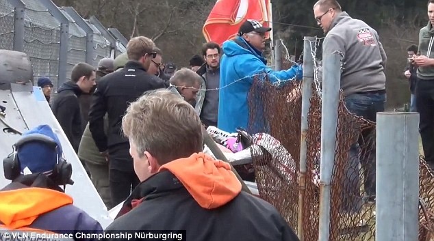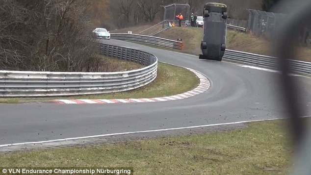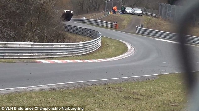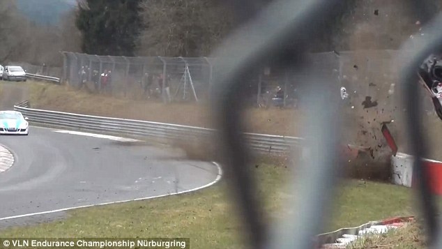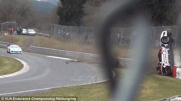 | Chiếc xe dựng đứng trong lúc lên dốc. Sau đó nó tiếp tục bay thêm 30 m trước khi lao vào hàng rào chắn an toàn dành cho người hâm mộ. |