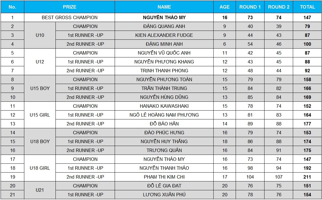 Thảo My mới 16 tuổi nhưng dễ dàng giành vị trí đứng đầu bảng U18 nữ. Thậm chí, tài năng trẻ này còn vượt qua các golf thủ nam để giành ngôi vô địch tuyệt đối (best gross) với tổng số gậy là 147.