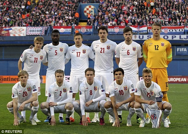 | Odegaard (hàng sau, ngoài cùng bên trái) chơi trọn 90 phút trong trận đấu gặp Croatia. Ảnh: Daily Mail. |