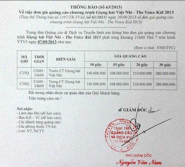 Theo đó, mỗi quảng cáo 30 giây có giá lên tới 280 triệu đồng, không phụ thuộc vào việc chiếu trước hay trong chương trình. Những quảng cáo ngắn hơn từ 10 đến 20 giây có gái tương ứng từ 140 triệu đồng đến 210 triệu đồng. Mức giá này đã tăng từ 10 đến 20 triệu so với thời điểm trước đó một tuần, đồng thời là chương trình có giá quảng cáo cao nhất trên VTV hiện nay.