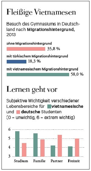 Trước hết cần nói ngay là bài báo này, đúng hơn là bài phỏng vấn với tiêu đề “Học luôn là ưu tiên hàng đầu” của Martin Spiewak, ký giả của “Die Zeit” và cũng là người chịu trách nhiệm cho cả chuyên đề, với GS Andreas Helmke, một chuyên gia về tâm lý phát triển và nghiên cứu giáo dục thực địa, tập trung vào việc giải thích nguyên nhân cho "thành tích xuất sắc" – như Spiewak nhấn mạnh của học sinh Việt Nam ở Đức, mà không giới thiệu cụ thể những kết quả khảo sát cập nhật, ngoài hai biểu đồ sau đây: