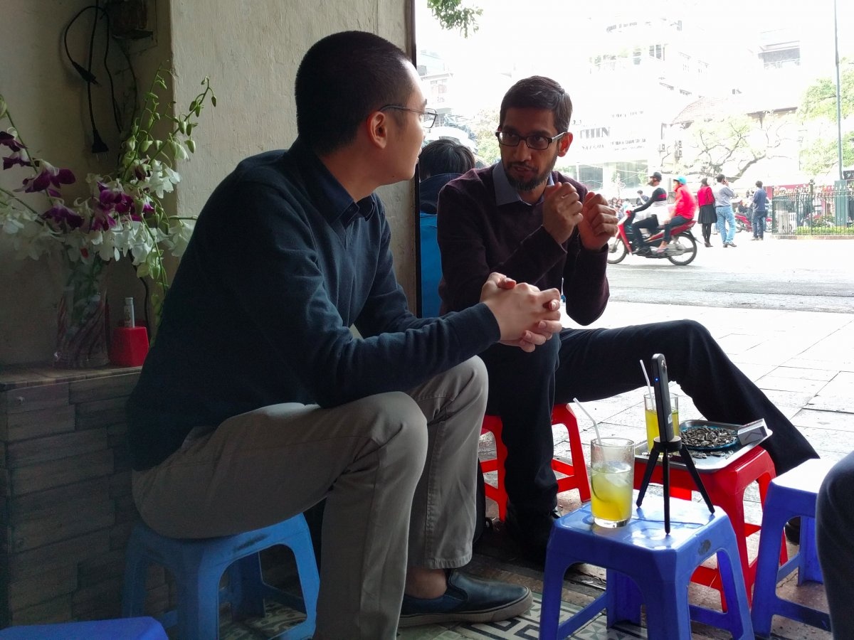 | Pichai ngồi chà tranh vỉa hè tại Hà Nội với "cha đẻ" Flappy Bird Nguyễn Hà Đông. |