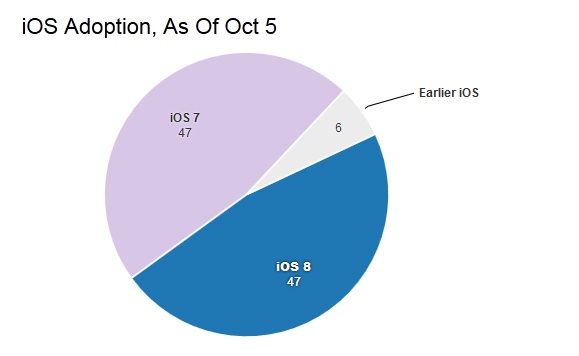 4 ngày sau khi phát hành, 46% người dùng thiết bị iOS đã tải về bản iOS 8 – theo nguồn tin từ Apple. Tuy nhiên, có vẻ như không ai có hứng thú tiếp tục cập nhật iOS 8 những ngày sau đó. Tính đến ngày 5/10 – hơn 2 tuần sau khi iOS chính thức phát hành, con số đó chỉ tăng thêm 1%, lên mức 47%.