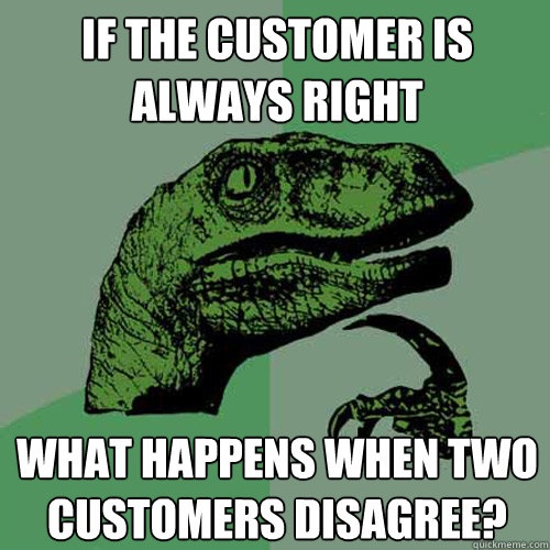 Với "khách hàng luôn đúng", nhiều khách hàng có thể lạm dụng nó để đòi hỏi mọi thứ, bởi hiển nhiên là quy tắc kia cho phép họ có quyền đó. Điều này khiến cho công việc của nhân viên của bạn càng trở nên khó khăn. Thêm vào đó, điều đó có nghĩa là những khách hàng thích lạm dụng kia sẽ có được những đối xử và quyền lợi tốt hơn những người dễ chịu. Điều này là không thể chấp nhận được, và sẽ hợp lý hơn nếu những khách hàng thân thiện được đối xử thân thiện.
