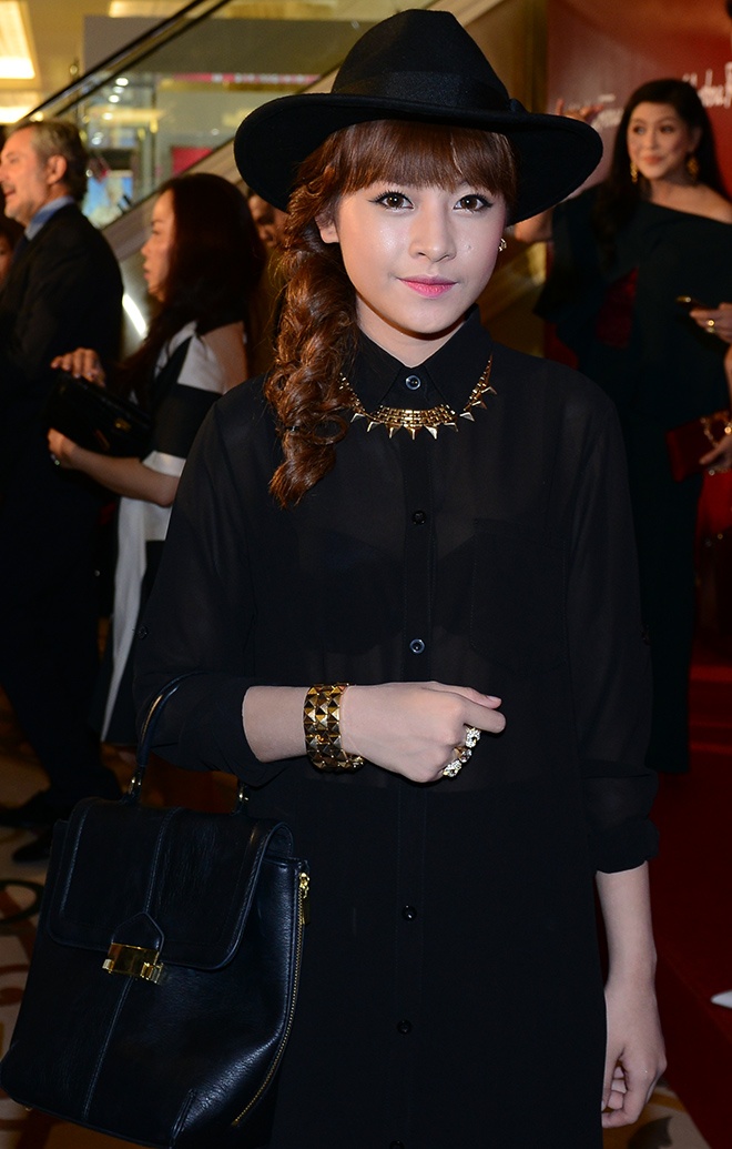 | Chi Pu diện áo voan trong suốt khi đi dự tiệc. Bộ trang phục sẫm màu khiến cô già đi nhiều so với tuổi thật. |