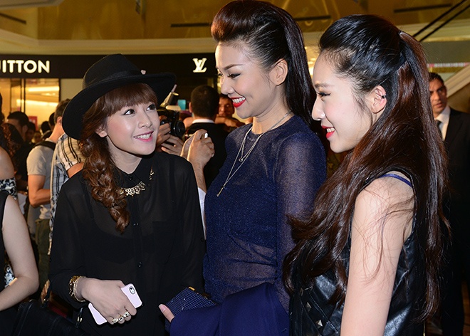 | Dư Văn Lạc tạo dáng bên Hà Anh - Thanh Hằng và ca sĩ Đàm Vĩnh Hưng. Thanh Hằng là gương mặt đại diện cho thương hiệu thời trang mới mở ở Hà Nội. Trong khi đó, Hà Anh đảm nhận vai trò MC của sự kiện. Không hẹn trước nhưng cả hai người đẹp đều diện tông màu tím than rất thời thượng. |