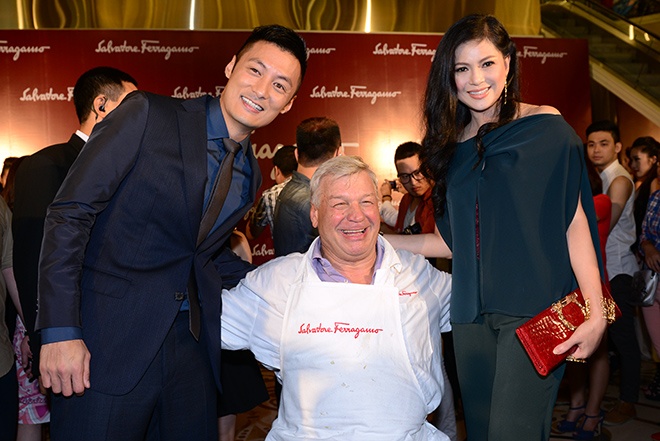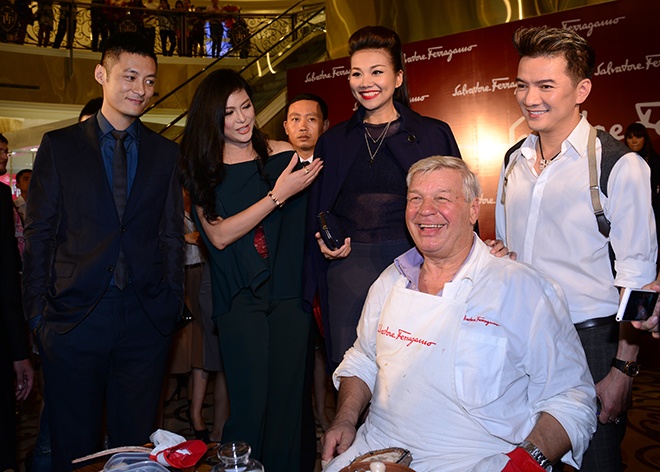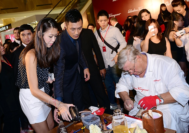 | Điểm nhấn của lễ khai trương showroom thời trang là việc một nghệ nhân đóng giày khoe tài ngay giữa đám đông. Dư Văn Lạc và bà Thủy Tiên rất hào hứng với việc xem người nghệ nhân có hơn 50 năm kinh nghiệm tới từ Florence - Ý đóng giày dù trước đó, họ đã có dịp xem qua công việc này. |