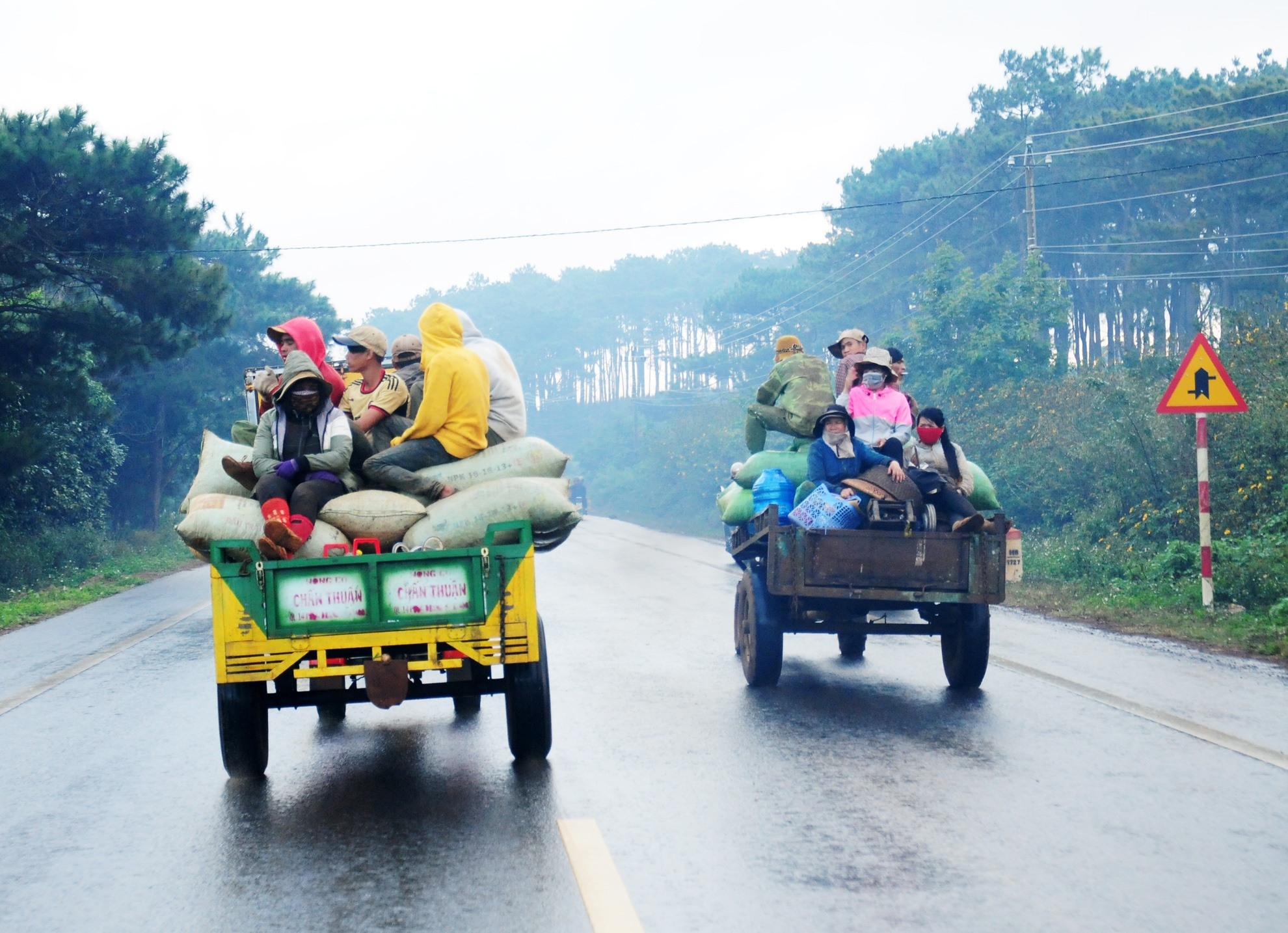 | Bất chấp lệnh cấp, nhiều xe công nông chở đầy người cùng hàng hóa cồng kềnh dàn hàng ngang trên quốc lộ 14 (đoạn qua huyện Krông Búk, tỉnh Đắk Lắk). Ảnh: Minh Hoàng. |
