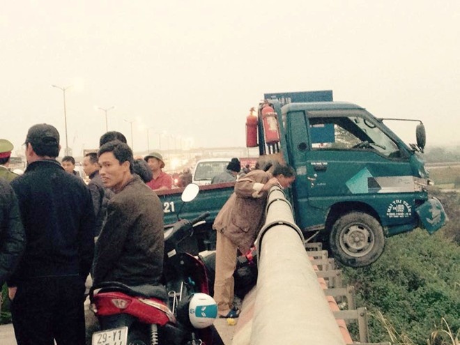 Xe tải lơ lửng trên cầu Thanh Trì sau va chạm. 16h ngày 15/12/2014, chiếc xe tải loại nhỏ biển kiểm soát Hà Nội chở bình oxy chạy tốc độ cao trên cầu Thanh Trì thì mất lái va chạm với người đi xe máy cùng chiều rồi lao thẳng vào thành cầu.