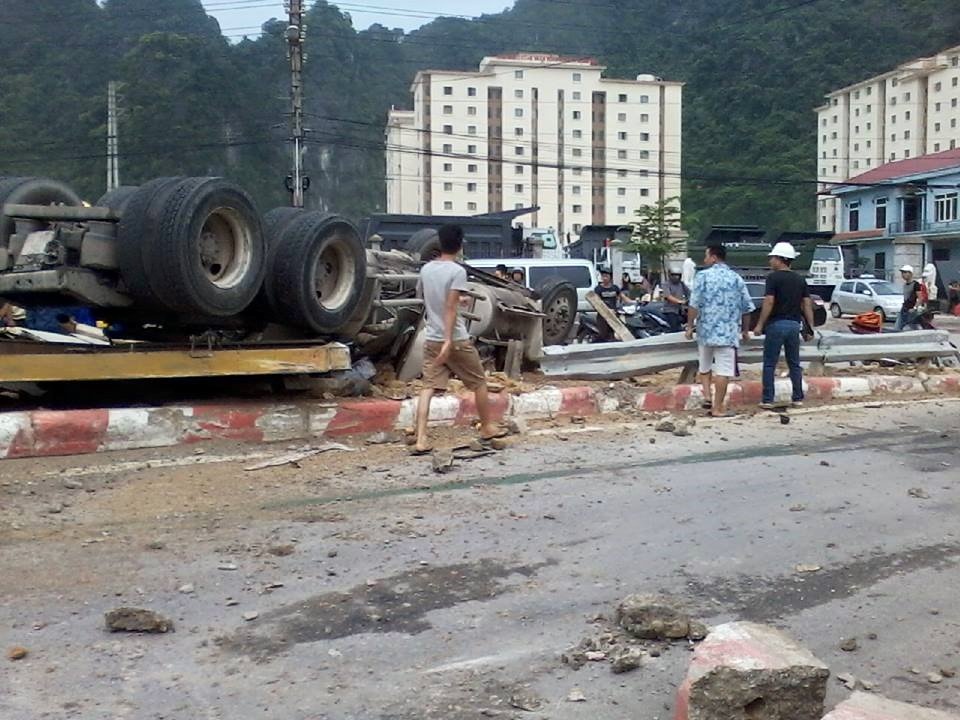 7h sáng 11/8, xe container biển kiểm soát Hải Phòng chạy tới km 10 tỉnh lộ 328 và đổ dốc ở địa phận phường Quang Hanh (Cẩm Phả, Quảng Ninh).