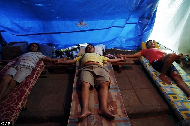 | Elvio Cristaldo (trái), Eligio Martinez (giữa) và Clemente Lovera (phải) nằm trên những cây thánh giá trong một ngôi lều. Ảnh: AP |