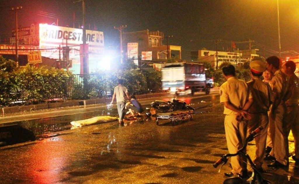 Xe máy của hai thanh niên mất lái tông vào dải phân cách rồi ngã vào làn đường ôtô. Đúng lúc này, một ôtô chạy từ phía sau không kịp xử lý đã cán hai người tử vong tại chỗ.