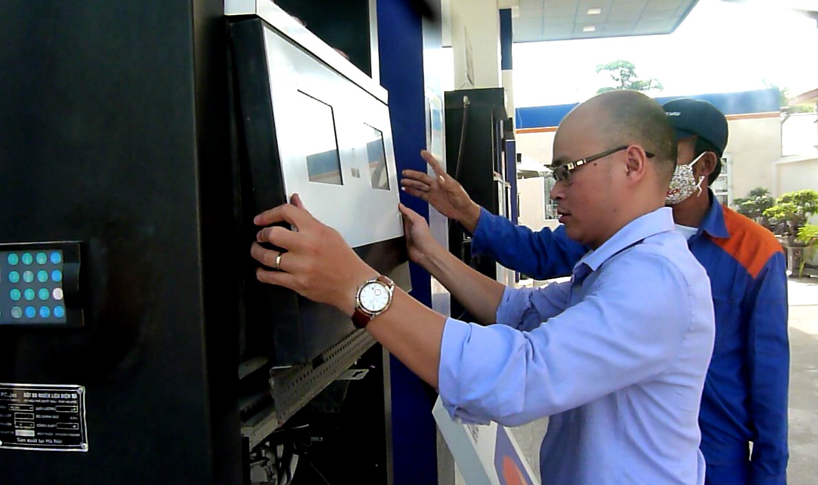| Ông Trịnh Đức Hiệp, quản lý cây xăng 117 Trần Cung mở hộp kỹ thuật cột xăng 614. Ảnh: Tùng Lâm. |