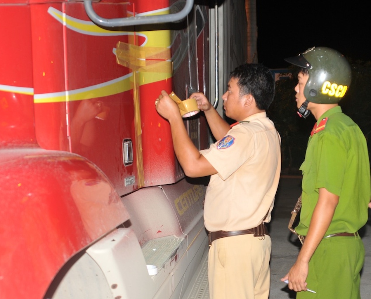 | Lực lượng CSGT niêm phong cửa xe đầu kéo. |