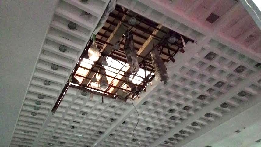 | Trần nhà bị bong 1 mảng lớn. Theo đánh giá ban đầu của lãnh đạo nhà thi đấu, nguyên nhân khiến nó đổ sập là do vật liệu không còn vững chắc do được sử dụng quá lâu chứ không phải do thấm nước. |