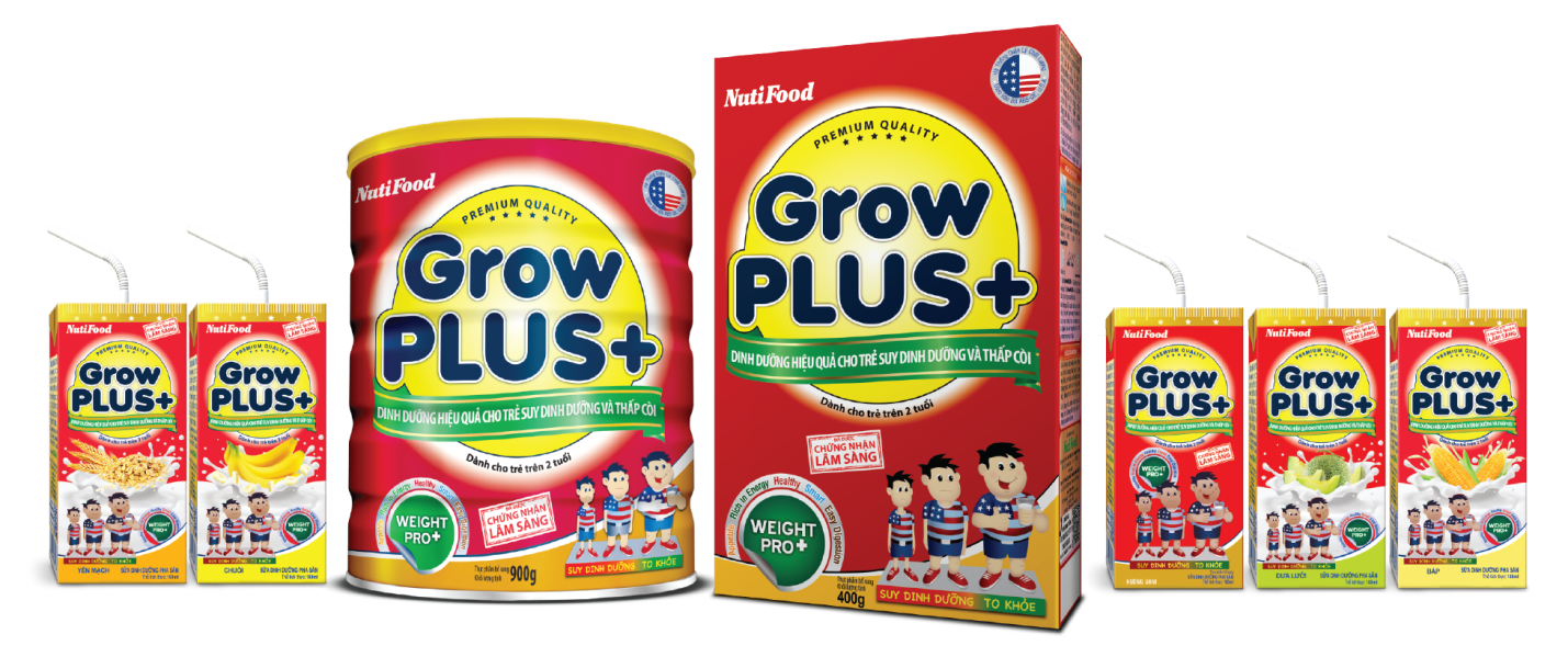 Trên nền tảng am hiểu về thể trạng của trẻ em Việt Nam, các chuyên gia dinh dưỡng NutiFood đã có nghiên cứu cho ra đời GrowPLUS+ - dinh dưỡng hiệu quả cho trẻ suy dinh dưỡng thấp còi dành cho trẻ em trên 2 tuổi bị còi xương, suy dinh dưỡng. GrowPLUS+ đã được chứng minh lâm sàng.