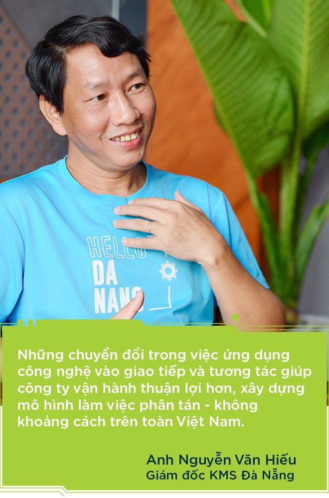 Vẫn phong cách giản dị thường thấy, song sau hai năm, chiếc áo anh Nguyễn Văn Hiếu - Giám đốc KMS Đà Nẵng - mặc có thêm dòng chữ Đà Nẵng bên cạnh KMS. Hai năm đánh dấu hành trình anh khoác lên mình trọng trách quản lý chi nhánh đầu tiên của công ty ở miền Trung.