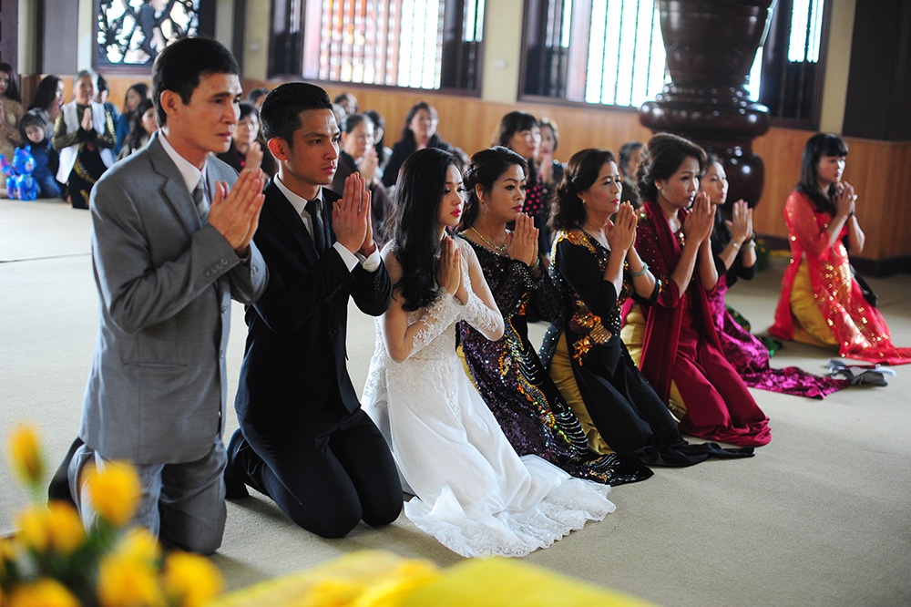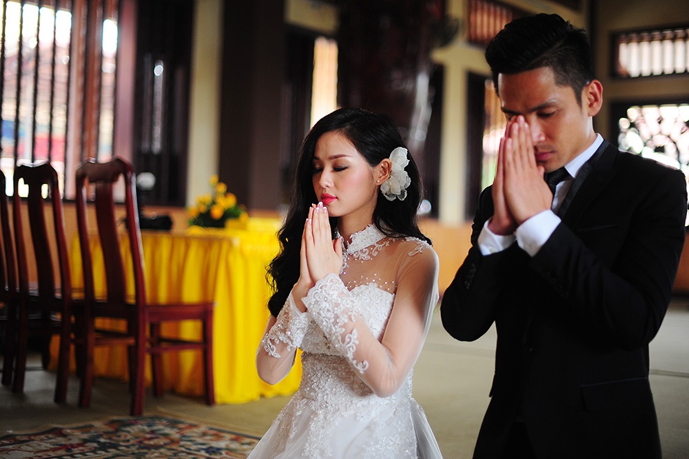 Vợ chồng hot girl đã bí mật lên chùa để làm lễ trước khi đám cưới diễn ra tại Hà Nội vào 10/1.