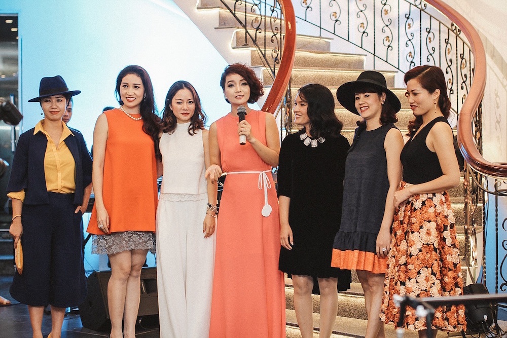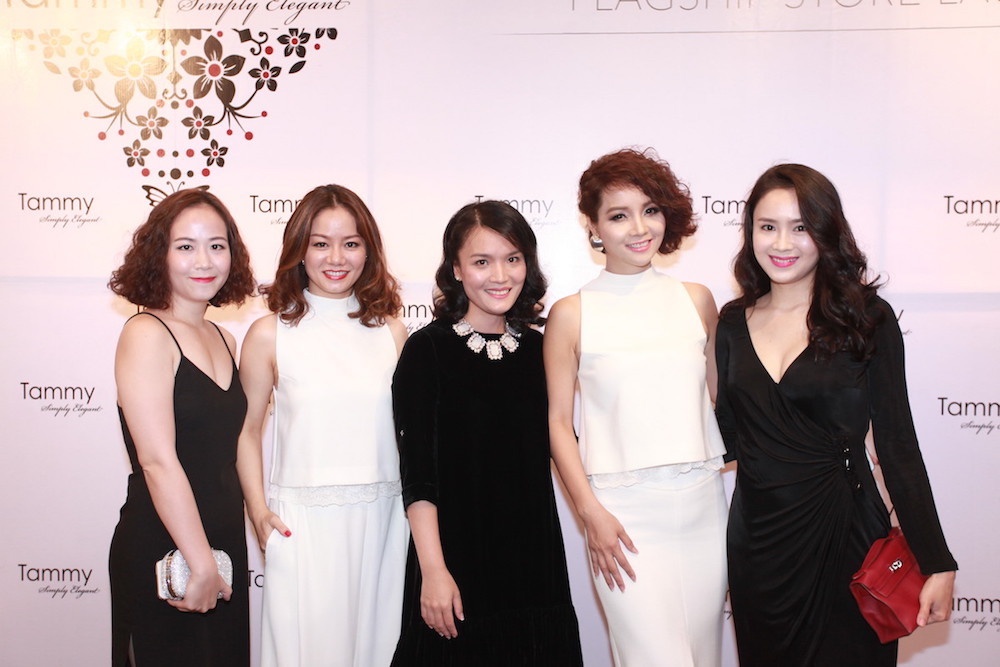 | Từ trái sang doanh nhân Giang Phạm, NTK Tâm Nguyễn, doanh nhân Hằng Lê, Giám đốc điều hành thương hiệu Tammy, diễn viên Mai Thu Huyền, diễn viên Hồng Diễm. |